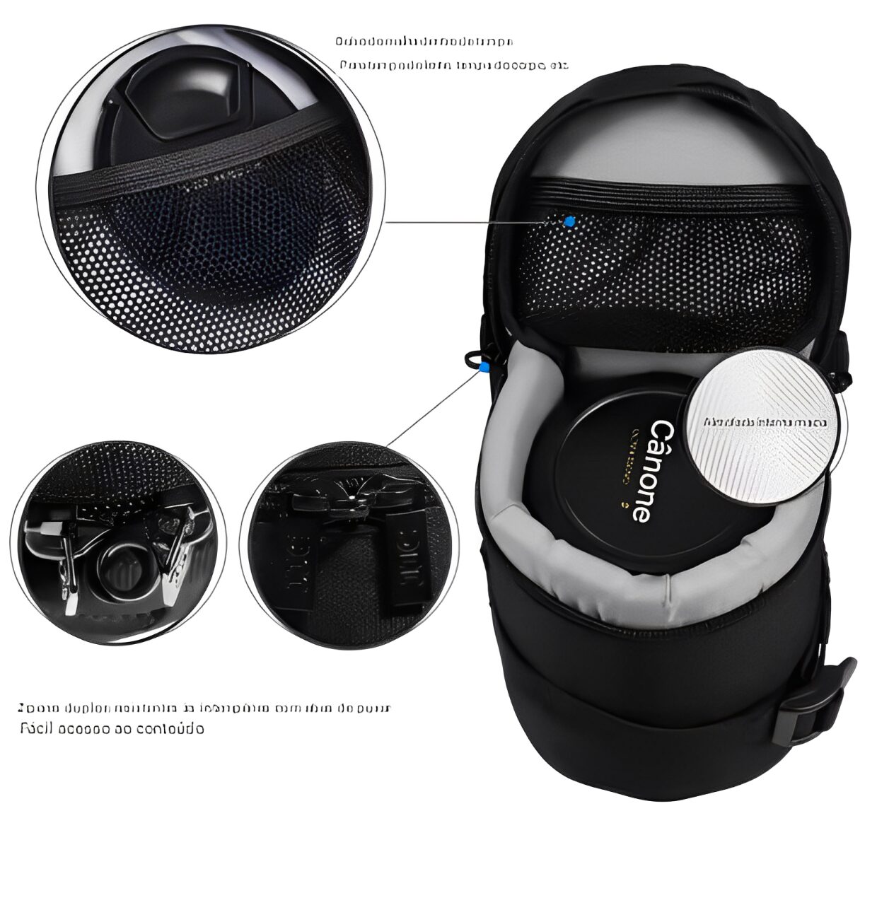 Essa bag para lente também é uma excelente escolha para quem precisa manter o equipamento organizado sem ocupar muito espaço. Seu design discreto e resistente torna a bag uma excelente aliada para quem preza pela segurança e facilidade de uso.