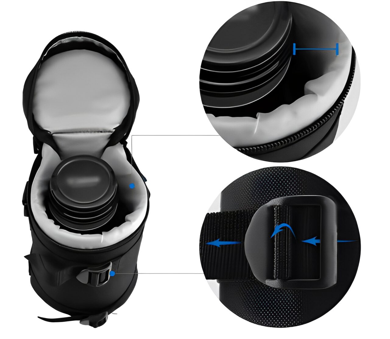 - Espaço ideal para transportar uma lente de forma compacta e organizada
