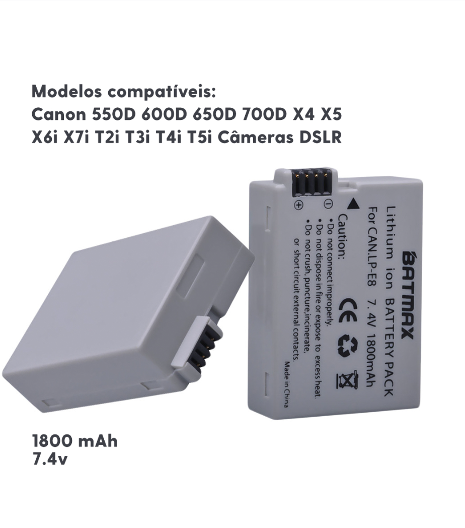 Além disso, o design da Bateria LP-E8 é compacto, facilitando o transporte e armazenamento, sendo ideal para quem trabalha em ambientes externos ou precisa de uma bateria adicional durante filmagens ou eventos prolongados. Seja para gravações de vídeos ou sessões de fotos, a LP-E8 Batmax garante desempenho de alta qualidade, proporcionando mais tempo para o trabalho criativo sem interrupções.