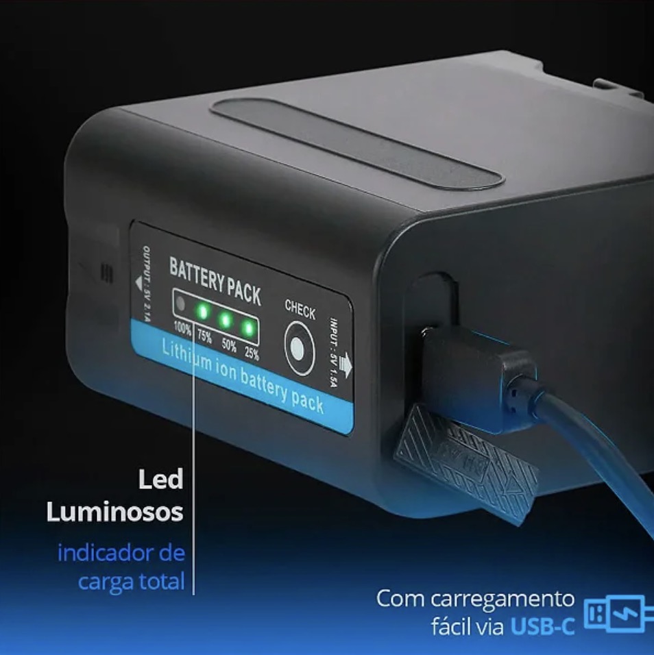 - Compatibilidade: Câmeras, iluminadores LED e dispositivos compatíveis com baterias NP-F