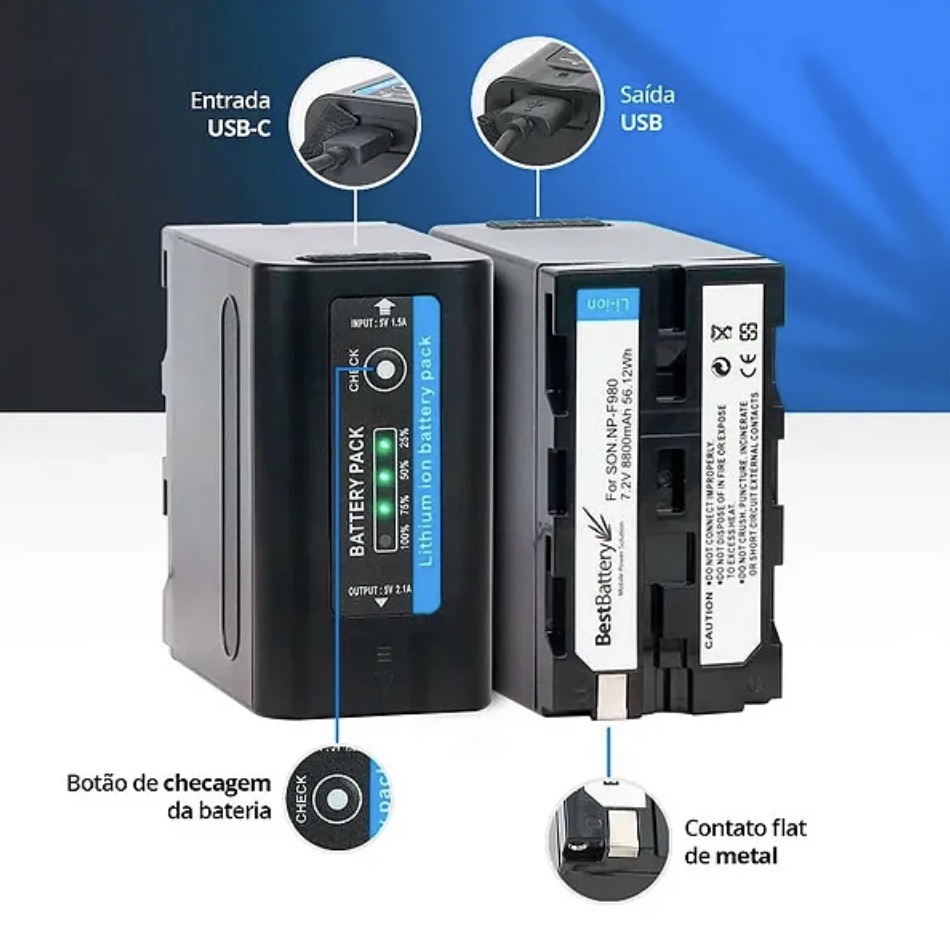 A Bateria NP-F980 é uma solução de energia versátil e de alta capacidade, ideal para alimentar câmeras, iluminadores LED e outros dispositivos compatíveis. Com 7800mAh, esta bateria oferece longa duração, permitindo que você trabalhe por mais tempo sem se preocupar com a carga. Além disso, ela funciona como um powerbank, permitindo carregar seus dispositivos móveis via USB. Perfeita para videomakers, fotógrafos e criadores de conteúdo que precisam de energia confiável e duradoura em qualquer situação.
