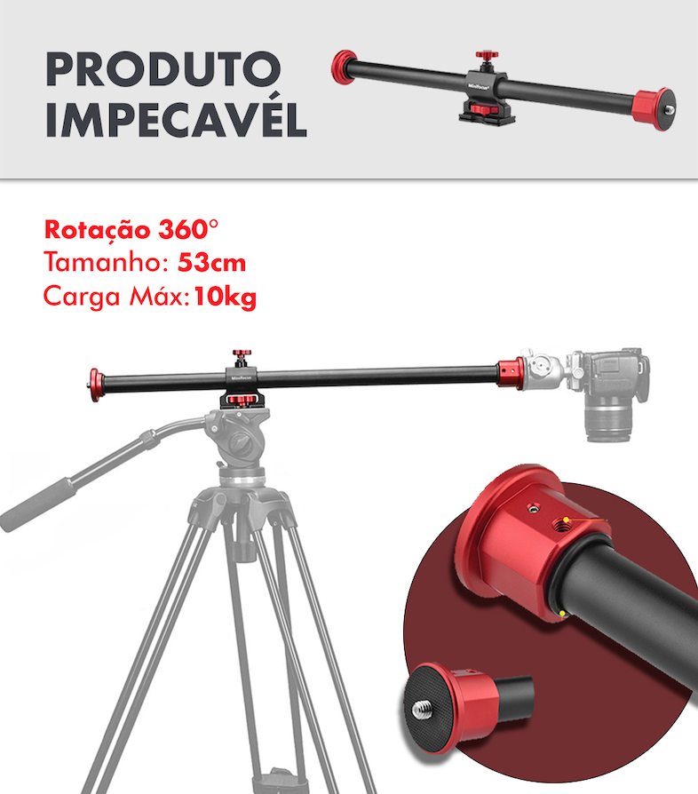 Construído com materiais de alta resistência, este braço proporciona estabilidade e segurança para equipamentos fotográficos e de vídeo. Seu sistema articulado e ajustável permite inclinação e rotação, garantindo liberdade criativa para capturar imagens com precisão. Além disso, ele pode ser acoplado a diversos modelos de tripés que possuam rosca de encaixe padrão, tornando-se um acessório versátil para diferentes tipos de produção.