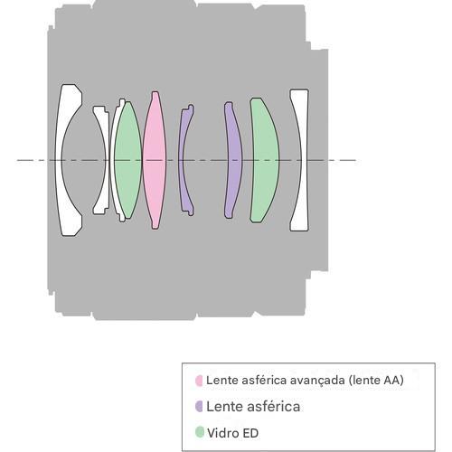 Construída com um design óptico avançado, a lente inclui elementos de vidro asférico e de dispersão extra baixa, garantindo imagens nítidas e com mínima distorção. O revestimento especial reduz reflexos e aberrações cromáticas, melhorando a qualidade da imagem.