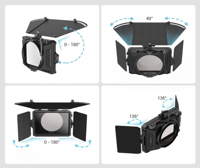 O design modular e robusto permite a fácil montagem e ajuste, sendo ideal para quem trabalha com produção de vídeo e precisa de flexibilidade e praticidade. Com suporte para filtros de 4×4” e 4×5.65”, o Mini Matte Box Pro proporciona proteção e controle total da iluminação sem adicionar peso excessivo ao conjunto de filmagem.