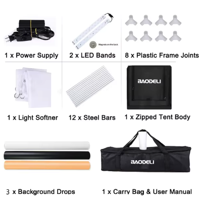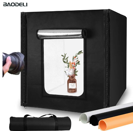 Além disso, o Mini Studio Portátil Baodeli é equipado com fundos intercambiáveis, oferecendo opções de diferentes cores para ajustar a estética das fotos conforme sua necessidade. Seja para vendas online, portfólios de fotografia ou até mesmo para gravações de vídeos de produtos, esse mini estúdio portátil oferece uma solução profissional e acessível para quem busca qualidade e eficiência em um produto de tamanho compacto.