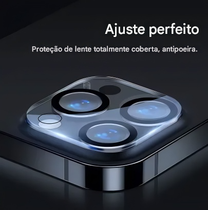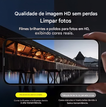 Fabricado com vidro temperado de alta resistência, o protetor protege as lentes contra danos acidentais, preservando a nitidez das imagens. Seu design ultrafino e transparente mantém a estética original do iPhone e não interfere na captura de luz ou no desempenho da câmera.