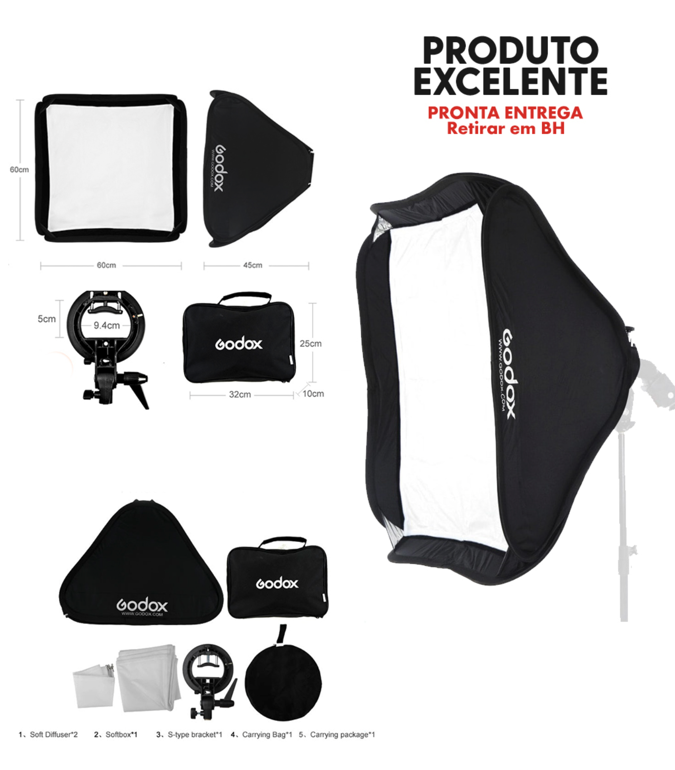 Ela é compatível com diversas fontes de luz, como flashes de estúdio e luzes contínuas, permitindo maior versatilidade em diferentes tipos de produções. Se você procura uma softbox que combine qualidade de iluminação, praticidade e um design compacto para facilitar o transporte, a Softbox Godox 60 x 60cm é a escolha ideal.